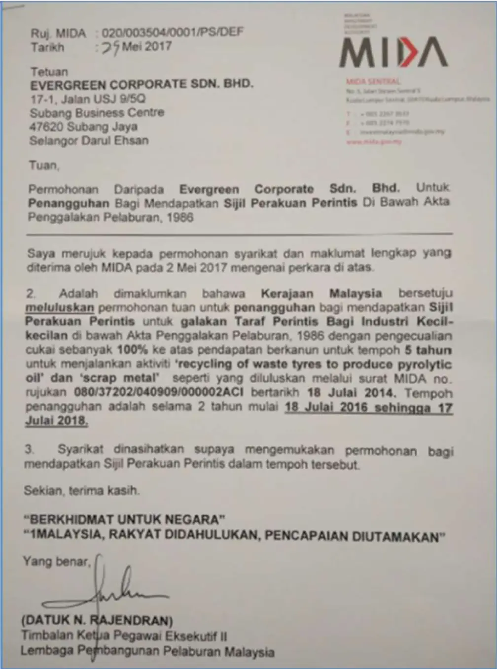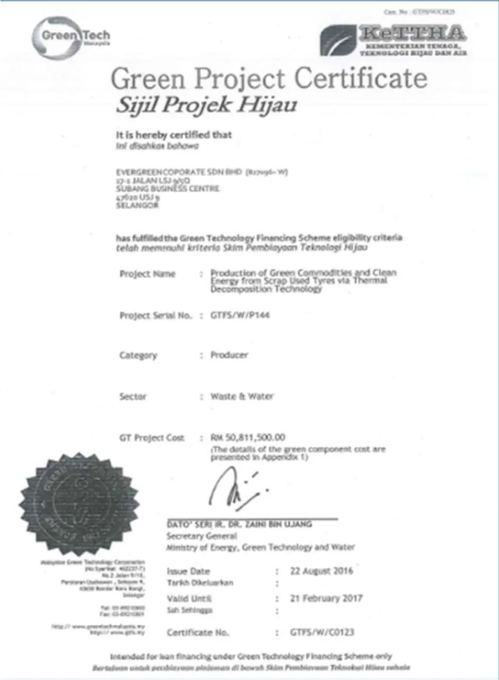 Evergreen Corporate Sdn. Bhd. (ECSB) is a leader in TRU green technologies in Malaysia that enable utility and industry customers to improve performance while lowering environmental impact. It is one of the affiliated companies of Pelaburan MARA Berhad (PMB). Evergreen Corporate has developed & is continuously developing the machineries which are techno- commercially proven, that provide high quality & quantity of industrial fuel oil from waste tyres.